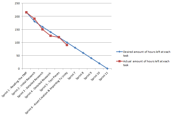 Over this week I have managed to get ahead of planned again, at the start of the week I had planned to created all my assets and have them imported into Unity and set up the quick play scene with working movement, timer, goal scoring and end game. I managed to complete this all by Wednesday and then that left today Thursday to start working on something different, I chose to start on online as I new it would take a lot of work on it to get it working right. I also updated my burndown chart and now I am ahead by 10 hours which is good.