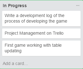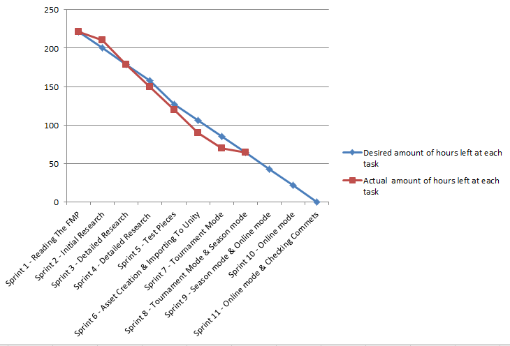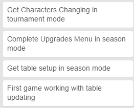 Over this first week back from the end of term break, I first started off with my tournament mode just finishing of the little bits to make it fully working, then once I felt that was done I started working on my season mode for the rest of the week, how ever I got stuck on a part I have still not managed to fix it, therefore it slowed me down but I’m still on track. Looking at my Burndown Chart I am still on track to have it all finished for the exhibition but I have slowed down compared to previous weeks. As I got stuck on getting my list updating after the first game, on Tello that is sitting in the In Progress tab for the next week.